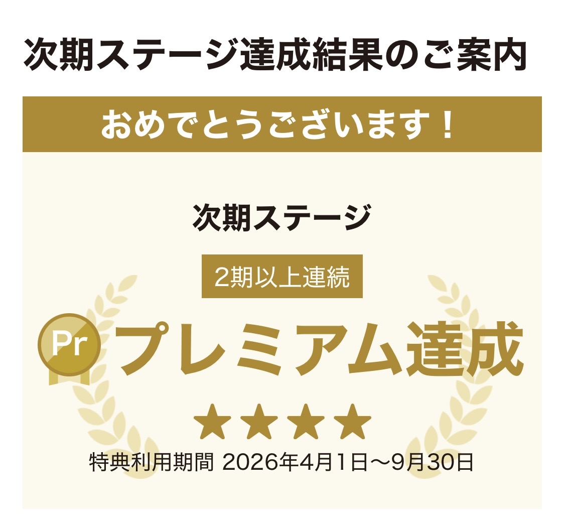 今回リブラが達成したのはプレミアムステージなのですが、プレミアムステージのみ、2期以上連続で達成した場合の特典が追加されます。
